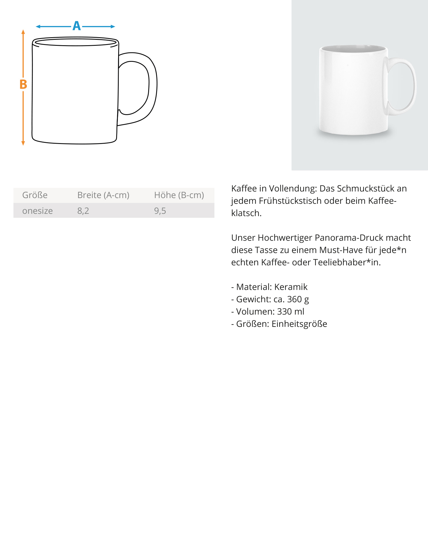 - Keramiktasse mit C-förmigem Henkel - Handspülung empfohlen - Höhe 95 mm, Ø 82 mm, ca. 360 g - Fassungsvermögen 330 ml